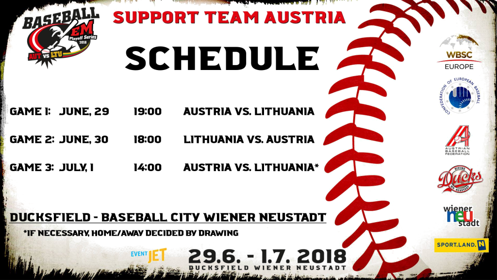 Die Baseball EM Playoff Series 2018 wird als Best-of-Three Serie zwischen Österreich und Litauen gespielt. Das Team, das als erstes zwei der drei Spiele gewinnt löst das Ticket zur A-Pool EM in Deutschland 2019.